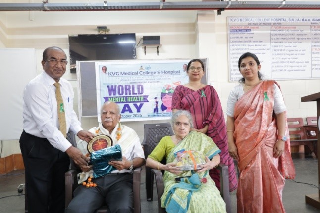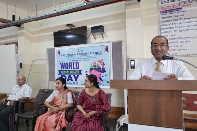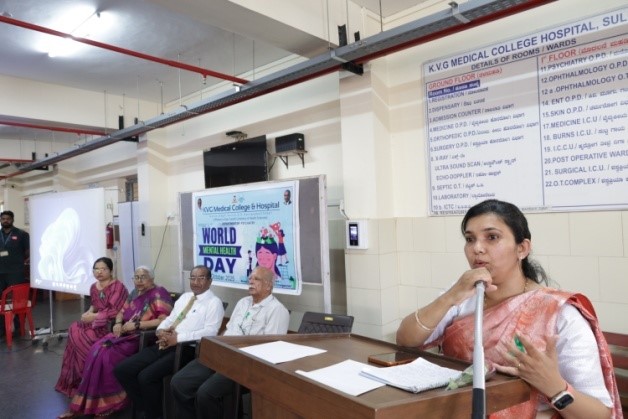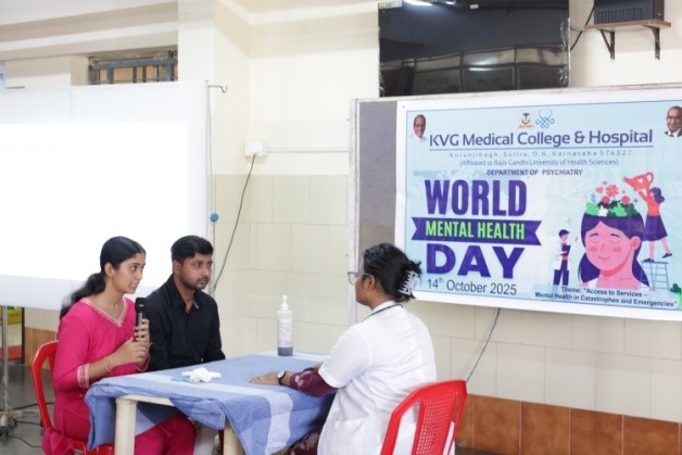 The Department of Psychiatry, KVG Medical College & Hospital, Sullia, organized a program to commemorate World Mental Health Day on 14th October 2025 at the OPD entrance. The event aimed to promote awareness and understanding of mental health under this year’s theme, “Access to Services: Mental Health in Catastrophes and Emergencies.”
