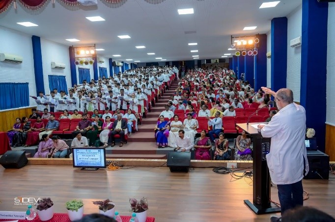 The ceremony concluded with the Presidential Address by Dr. K. V. Chidananda, who inspired the students to uphold ethical values, dedication, and service-mindedness throughout their medical careers. The programme formally ended with a vote of thanks proposed by Dr. Damodar D, followed by the National Anthem. The event marked a memorable and meaningful beginning to the MBBS journey of the 2025–26 batch, reinforcing the ideals of professionalism and responsibility expected of future medical practitioners.